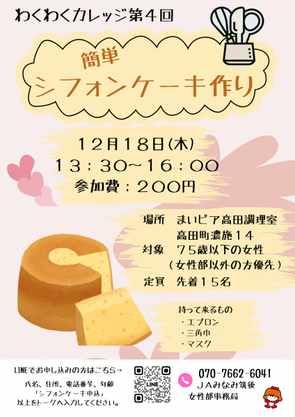 わくわくカレッジ第4回を開催いたします。 今回は「シフォンケーキ作り」です! 定員が15名となってお…