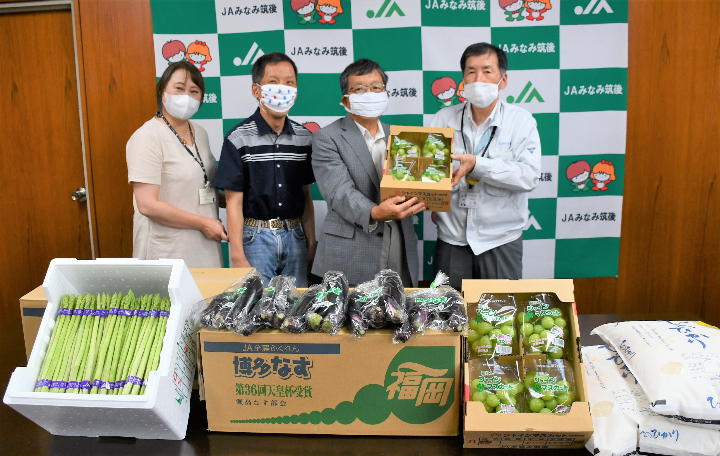 JAみなみ筑後は8月5日、社会貢献の一環として大牟田市甘木の児童養護施設「甘木山学園」とみやま市瀬高町の特定非営利活動法人「きよみず作業所」に米やナスなどの農産物を寄贈しました。これは、同JA役職員連盟が社会貢献活動として取り組んでいるもので、福祉施設への寄贈を数年前から続けています。寄贈式では、吉田昭組合長が農産物を手渡しました。