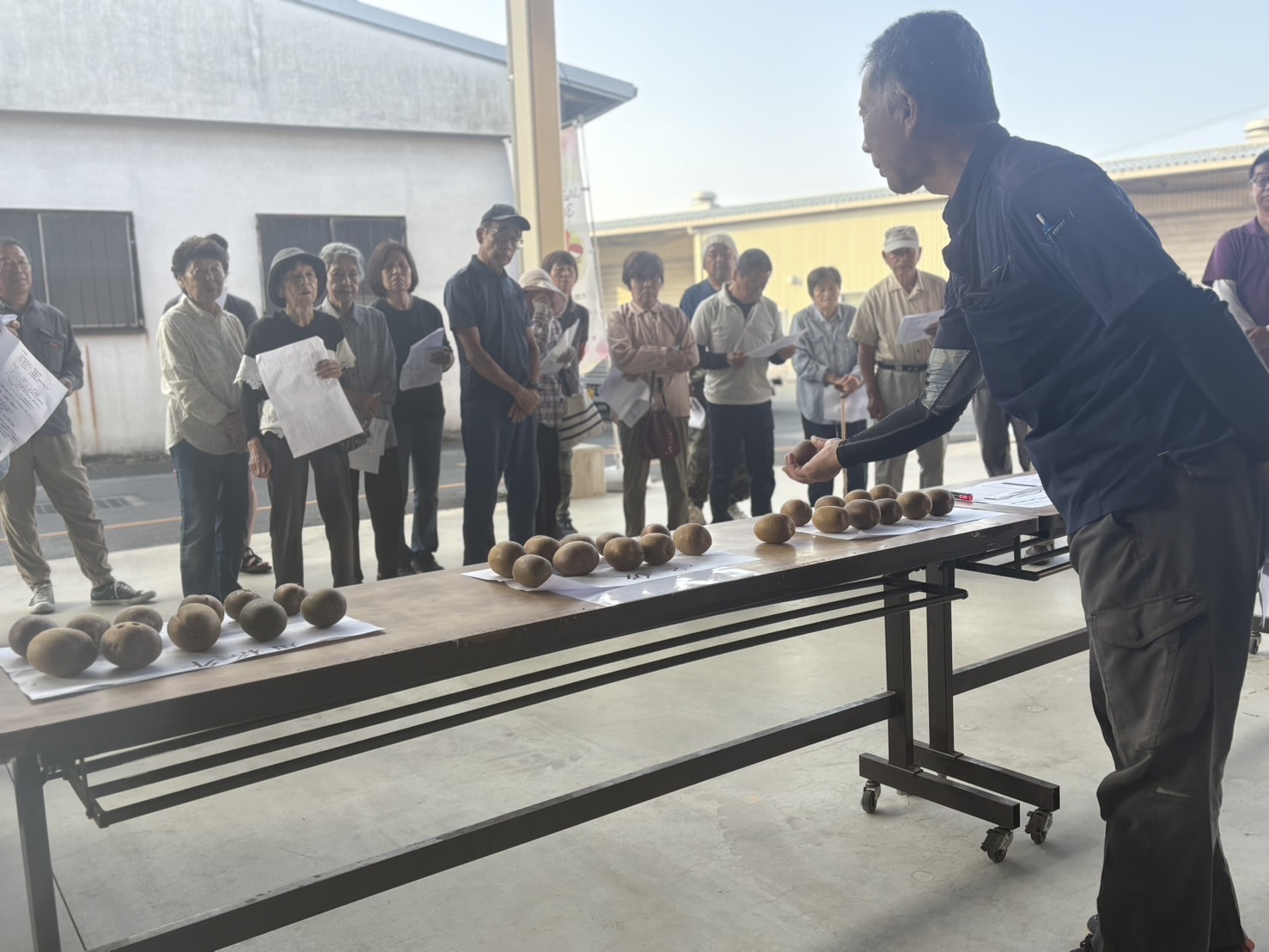 当日は、果実サンプルを用いて、果形や色、傷の有無など外観規格について詳しく説明しました。参加者に対し、規格に沿った選別の徹底を呼びかけました。