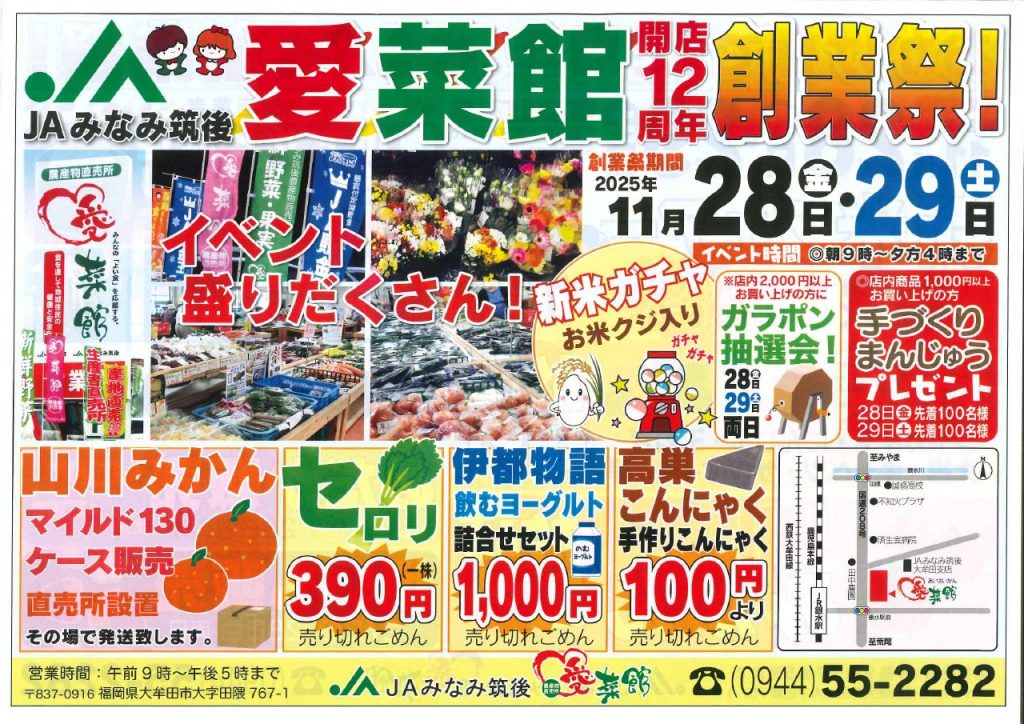 愛菜館12周年創業祭 開催! 分類:お知らせ 2025.11.27 JAみなみ筑後の直売所「愛菜館」は開店12周年を迎えました。 そこで、11月28日(金)、29(土)で創業祭を開催いたします! 農産物の販売や新米フェア、野菜やみかんの詰め放題を行います。数に限りがございますので、お早めにお越しください! また、めだか(29日のみ)や焼き芋(両日)の販売も行います。 店内で1,000円以上お買い上げの方に「手作りまんじゅう」をプレゼント! さらに、店内2,000円以上お買い上げの方にはガラポン抽選会をご用意しております! 皆様のご来店お待ちしております!! 記事一覧へ戻る